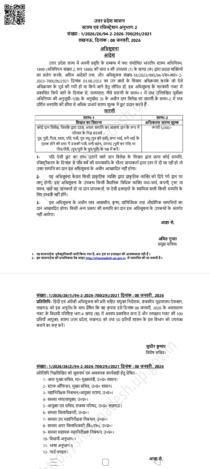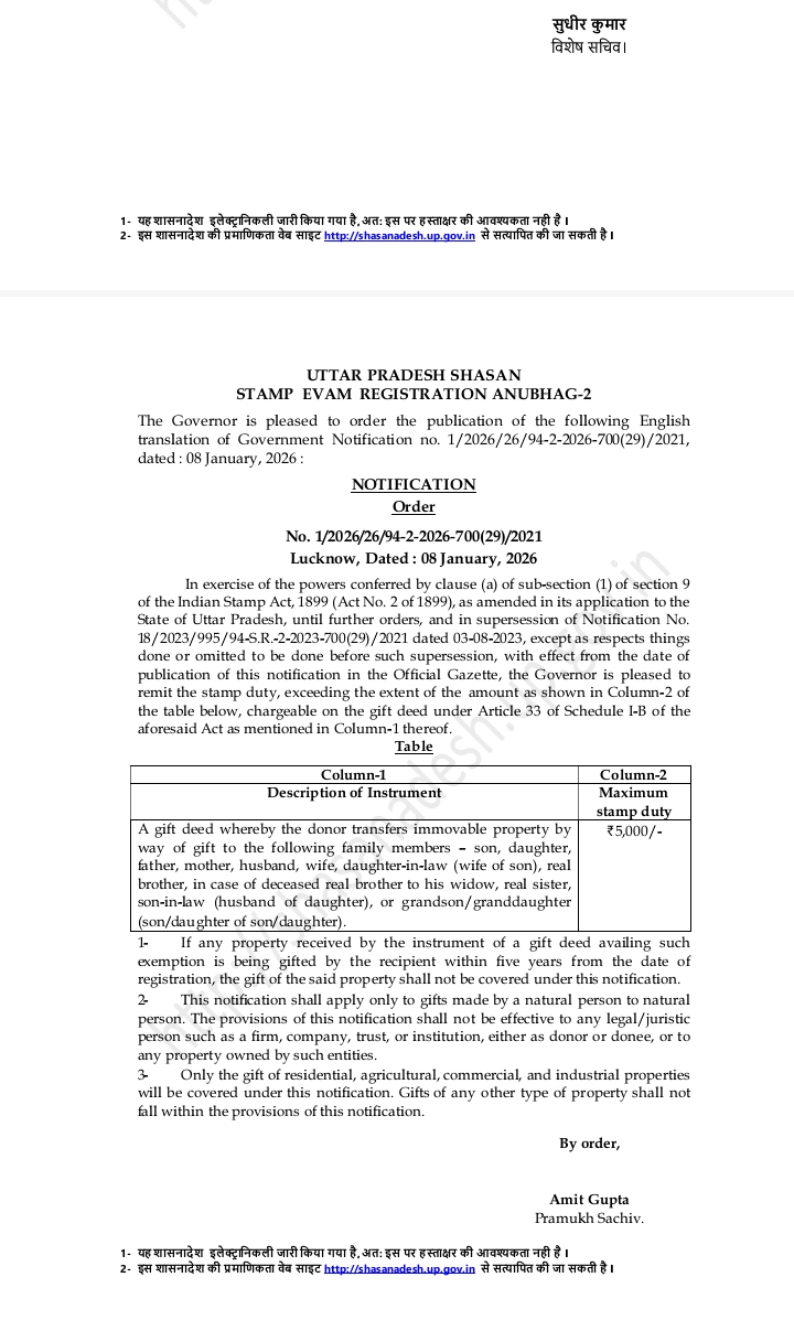 लखनऊ। उत्तर प्रदेश सरकार ने प्रदेशवासियों को बड़ी राहत देते हुए पारिवारिक सदस्यों के मध्य अचल संपत्ति के दान विलेख (गिफ्ट डीड) पर स्टाम्प शुल्क में विशेष छूट प्रदान करने का निर्णय लिया है। स्टाम्प एवं रजिस्ट्रेशन अनुभाग-2 द्वारा 08 जनवरी, 2026 को इस संबंध में औपचारिक अधिसूचना और शासनादेश जारी कर दिया गया है। भारतीय स्टाम्प अधिनियम, 1899 की शक्तियों का प्रयोग करते हुए शासन ने अब आवासीय और कृषि संपत्तियों के साथ-साथ व्यावसायिक एवं औद्योगिक संपत्तियों के दान पर भी अधिकतम 5,000 रुपये का स्टाम्प शुल्क निर्धारित कर दिया है।