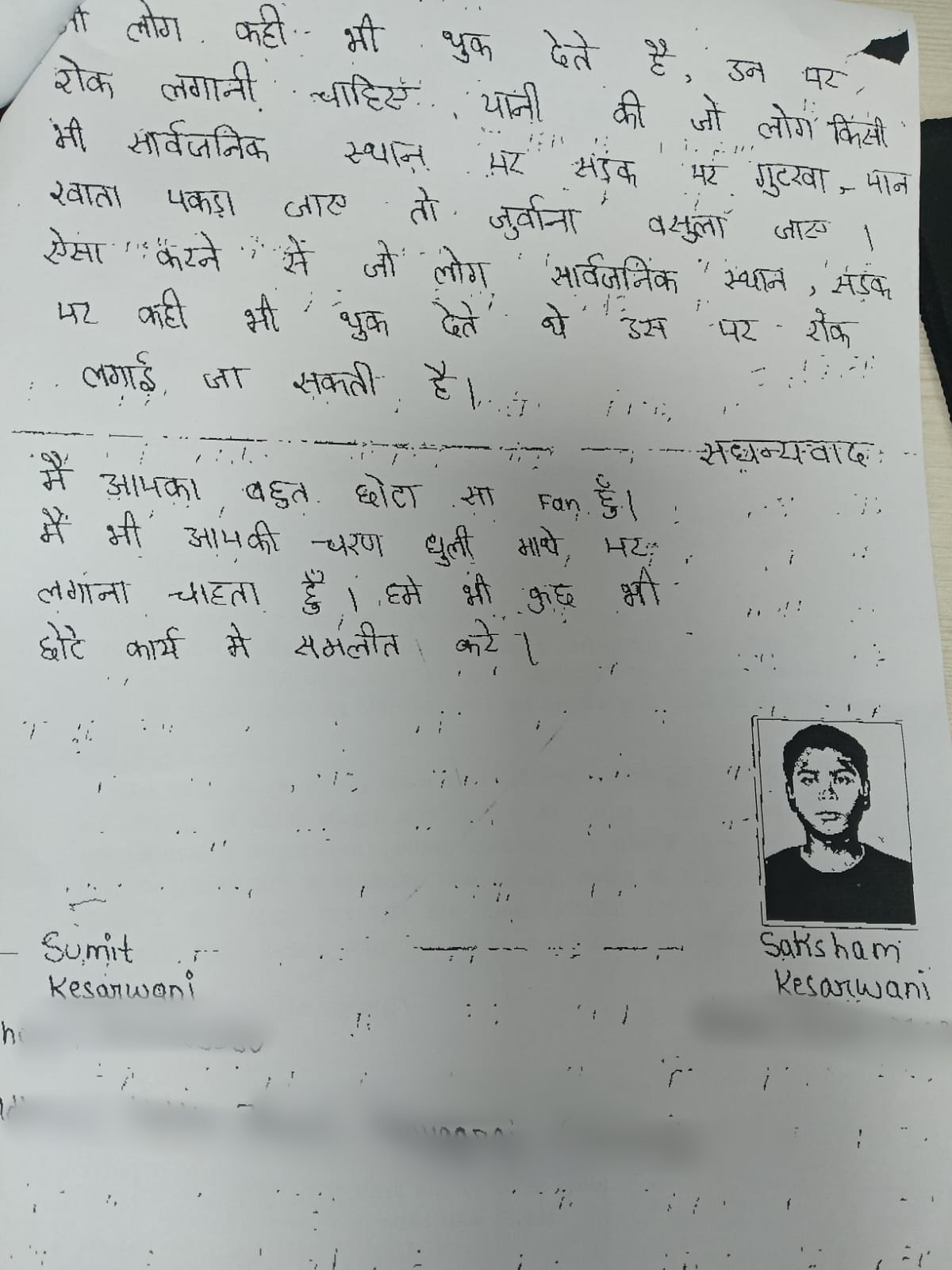 मुख्यमंत्री को लिखे पत्र में बालक ने सार्वजनिक स्थानों पर कूड़ा फेंकने तथा पान-गुटखा खाकर इधर-उधर थूकने वालों पर सख्त रोक लगाने और जुर्माना लगाए जाने की मांग की है। उसका कहना है कि जब तक नियमों का कड़ाई से पालन नहीं कराया जाएगा, तब तक लोगों की आदतों में बदलाव संभव नहीं है और शहर को साफ-सुथरा बनाना मुश्किल रहेगा।पत्र में सुमित केसरवानी ने यह भी लिखा है कि स्वच्छता के लिए हर नागरिक को अनुशासन और जिम्मेदारी निभानी होगी। उसने स्पष्ट किया है कि हर नागरिक की छोटी-छोटी जिम्मेदारियां ही शहर की बड़ी तस्वीर बदल सकती हैं।