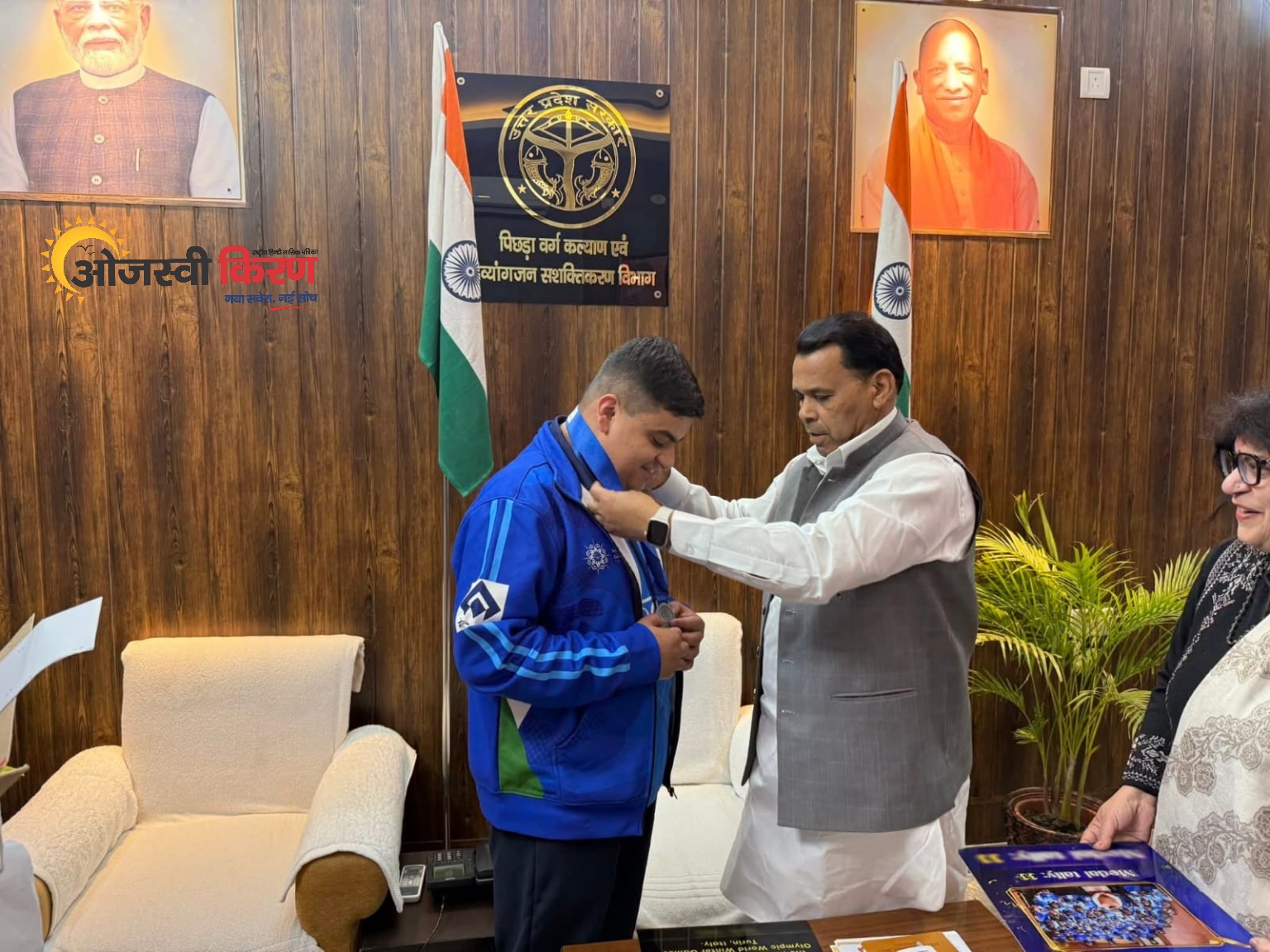लखनऊ। स्पेशल ओलंपिक में अंतरराष्ट्रीय स्तर पर देश और प्रदेश का नाम रोशन करने वाले 32 वर्षीय खिलाड़ी वासु तिवारी को रविवार को पिछड़ा वर्ग कल्याण एवं दिव्यांगजन सशक्तिकरण राज्यमंत्री ( स्वतंत्र प्रभार) नरेंद्र कश्यप ने अपने लखनऊ स्थित आवास पर मेडल पहनाकर सम्मानित किया। मंत्री कश्यप ने वासु की उपलब्धियों की सराहना करते हुए उनका उत्साहवर्धन किया और भविष्य में हरसंभव सहयोग का भरोसा दिलाया।