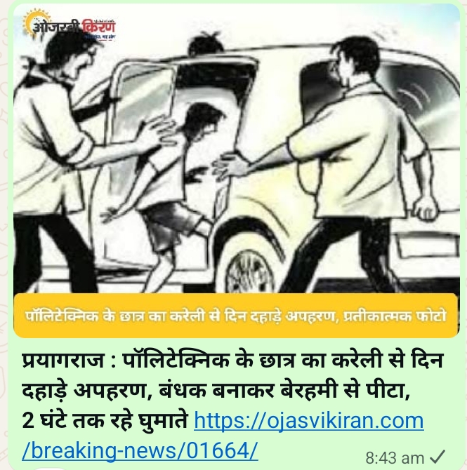 प्रयागराज। पॉलिटेक्निक छात्र के दिनदहाड़े अपहरण और पिटाई के मामले में पुलिस को पहली सफलता मिली है। इस सनसनीखेज वारदात में शामिल एक आरोपी माजिद को पुलिस ने गिरफ्तार कर लिया है, जबकि उसके चार अन्य साथी अब भी फरार हैं। घटना के 36 घंटे से ज्यादा समय बीतने के बावजूद अपहरण में प्रयुक्त कार बरामद नहीं हो सकी है, जिससे करेली पुलिस की कार्यप्रणाली पर गंभीर सवाल खड़े हो रहे हैं।