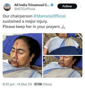 पश्चिम बंगाल की सीएम ममता बनर्जी चोटिल हो गई हैं, टीएमसी ने अपने X हैंडल पर इसकी जानकारी दी है