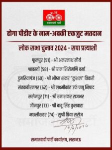 डुमरियागंज,संतकबीर नगर,जौनपुर सदर,जौनपुर मछलीशहर (सुरक्षित),फूलपुर में प्रत्याशियों की घोषणा कर जातिगत समीकरण साधने का प्रयास सपा