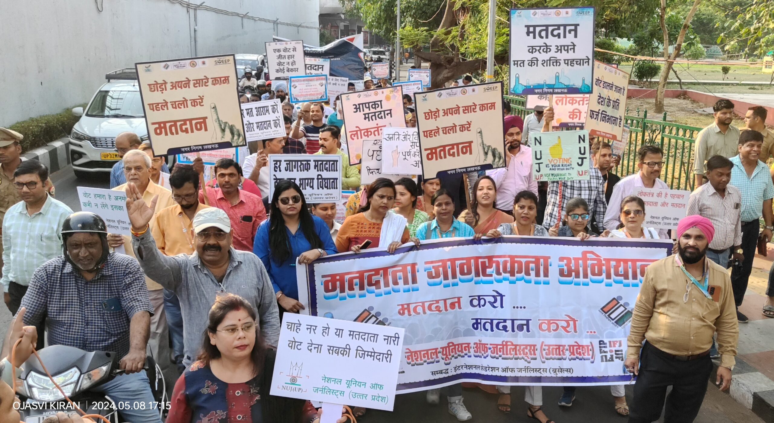 लोकतंत्र के महापर्व में देश में लखनऊ के पत्रकारों ने मतदाता जागरूकता रैली जैसे अभिनव प्रयास किया। एनयूजे, उत्तर प्रदेश के संरक्षक प्रमोद गोस्वामी, के बक्श सिंह, सुरेंद्र कुमार दुबे एवं अजय कुमार के मार्गदर्शन, प्रदेश अध्यक्ष वीरेंद्र सक्सेना, प्रदेश महामंत्री संतोष भगवन एवं प्रदेश कोषाध्यक्ष अनुपम चौहान के नेतृत्व में बुधवार शाम को भव्य रैली निकली। रैली का संचालन लखनऊ जिलाध्यक्ष आशीष मौर्य, महामंत्री पद्माकर पांडेय एवं कोषाध्यक्ष अनुपम पांडेय ने किया। इस दौरान लखनऊ के उपाध्यक्ष अभिनव श्रीवास्तव, उपाध्यक्ष मीनाक्षी वर्मा, उपाध्यक्ष संगीता सिंह, अरुण शर्मा टीटू, मंत्री नागेंद्र सिंह, संगठन मंत्री अश्विनी जायसवाल, आलोक श्रीवास्तव, धीरेन्द्र मिश्र, सदस्य रूपेंद्र उपाध्याय, डॉ.राजेश वर्मा, मोहन वर्मा, क्षितिज भारद्वाज आदि मौजूद रहे। नगर निगम कर्मचारी संघ के अध्यक्ष आनंद वर्मा, महामंत्री रामअचल, उपाध्यक्ष शमील अखलाक, संगठन मंत्री अर्जुन यादव, शत्रोहन लाल, यश गुप्ता, रेखा यादव आदि कर्मचारी नेताओं की मौजूदगी रही। टेम्पो-टैक्सी एवं ऑटो-रिक्शा संयुक्त मोर्चा, लखनऊ के अध्यक्ष पंकज दीक्षित के नेतृत्व में उनकी टीम ने हौसला बढ़ाया।