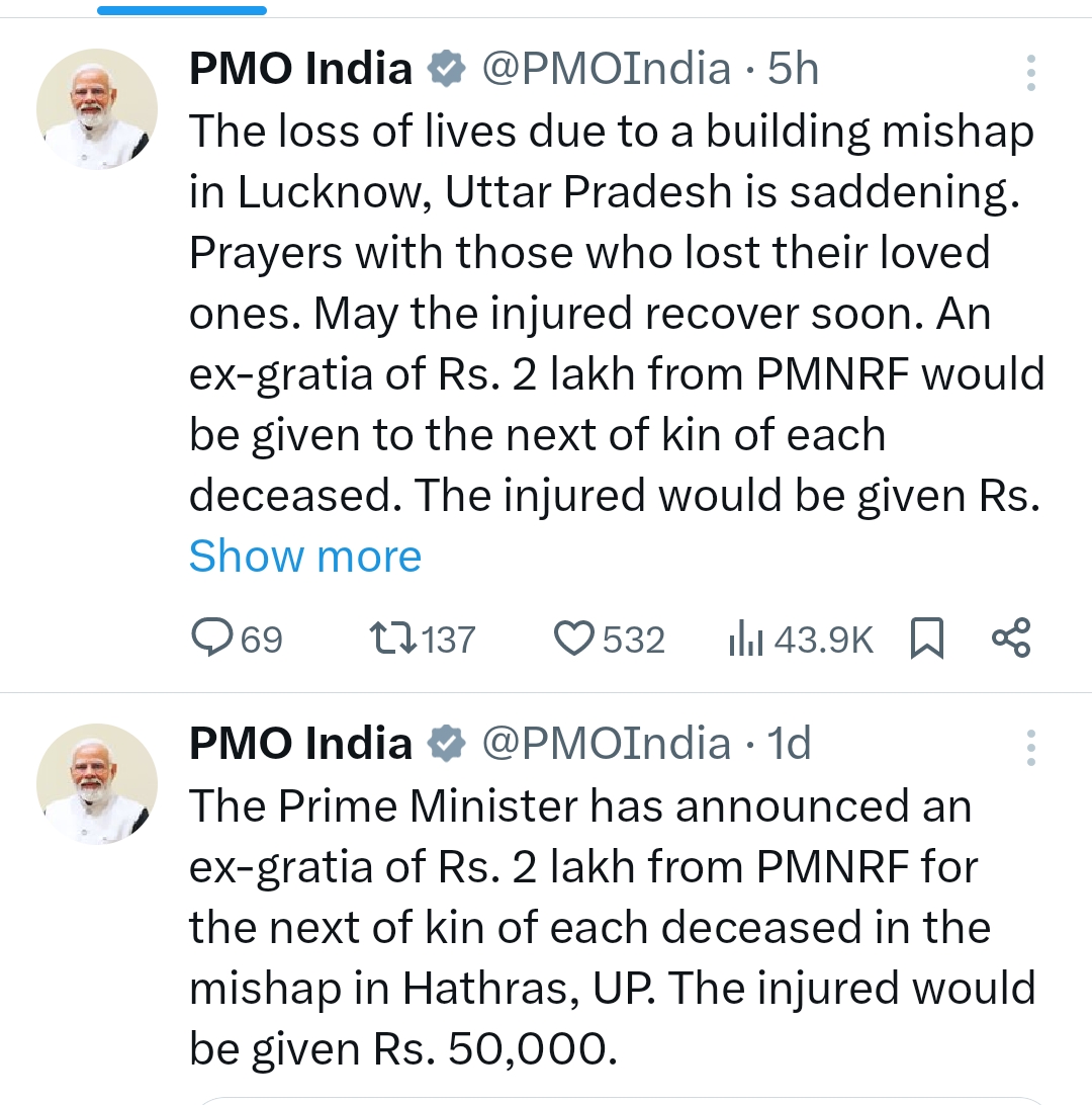 प्रधानमंत्री मोदी ने आज अपने आधिकारिक एक्स पोस्ट में कहा कि उत्तर प्रदेश के लखनऊ में एक इमारत दुर्घटना में लोगों की मौत दुखद है। हम उन लोगों के साथ प्रार्थना करते हैं, जिन्होंने अपने प्रियजनों को खो दिया है। घायलों के जल्द स्वस्थ होने की कामना करता हूँ। प्रधानमंत्री राष्ट्रीय राहत कोष से प्रत्येक मृतक के परिजन को 2 लाख रुपये की अनुग्रह राशि दी जाएगी। जबकि घायलों को 50,000 रुपये दिए जाएंगे।