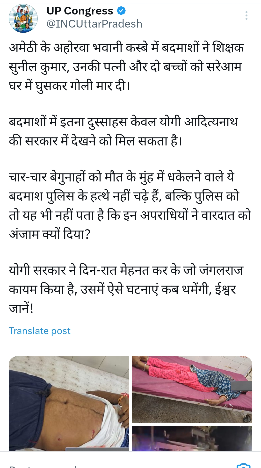 इस घटना पर यूपी कांग्रेस ने योगी सरकार पर निशाना साधा है। उन्होंने सोशल मीडिया एक्स पर लिखा कि अमेठी के अहोरवा भवानी कस्बे में बदमाशों ने शिक्षक सुनील कुमार, उनकी पत्नी और दो बच्चों को सरेआम घर में घुसकर गोली मार दी। बदमाशों में इतना दुस्साहस केवल योगी आदित्यनाथ की सरकार में देखने को मिल सकता है। चार-चार बेगुनाहों को मौत के मुंह में धकेलने वाले ये बदमाश पुलिस के हत्थे नहीं चढ़े हैं, बल्कि पुलिस को तो यह भी नहीं पता है कि इन अपराधियों ने वारदात को अंजाम क्यों दिया? योगी सरकार ने दिन-रात मेहनत कर के जो जंगलराज कायम किया है, उसमें ऐसे घटनाएं कब थमेंगी, ईश्वर जानें।