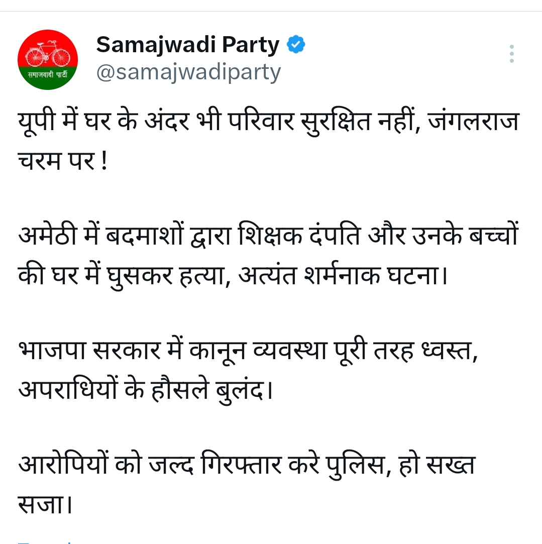 सपा की मीडिया सेल ने अमेठी की घटना को लेकर सोशल मीडिया एक्स पर पोस्ट किया। लिखा कि सरेशाम घर में घुसकर एक शिक्षक, उसकी पत्नी और दो मासूम बच्चों की हत्या अंधाधुंध फायरिंग करके कर दी गई। सीएम योगी जो दूसरे प्रदेशों में जाकर सरेआम मंच से यूपी की कानून व्यवस्था का झूठा राग अलापते हैं, वो शर्म करें। यूपी में लगातार जनता जघन्य अपराधों से भयाक्रांत है। सपा मुखिया अखिलेश यादव ने एक्स पर लिखा कि कोई है..कही है…नई चाहिए भाजपा।