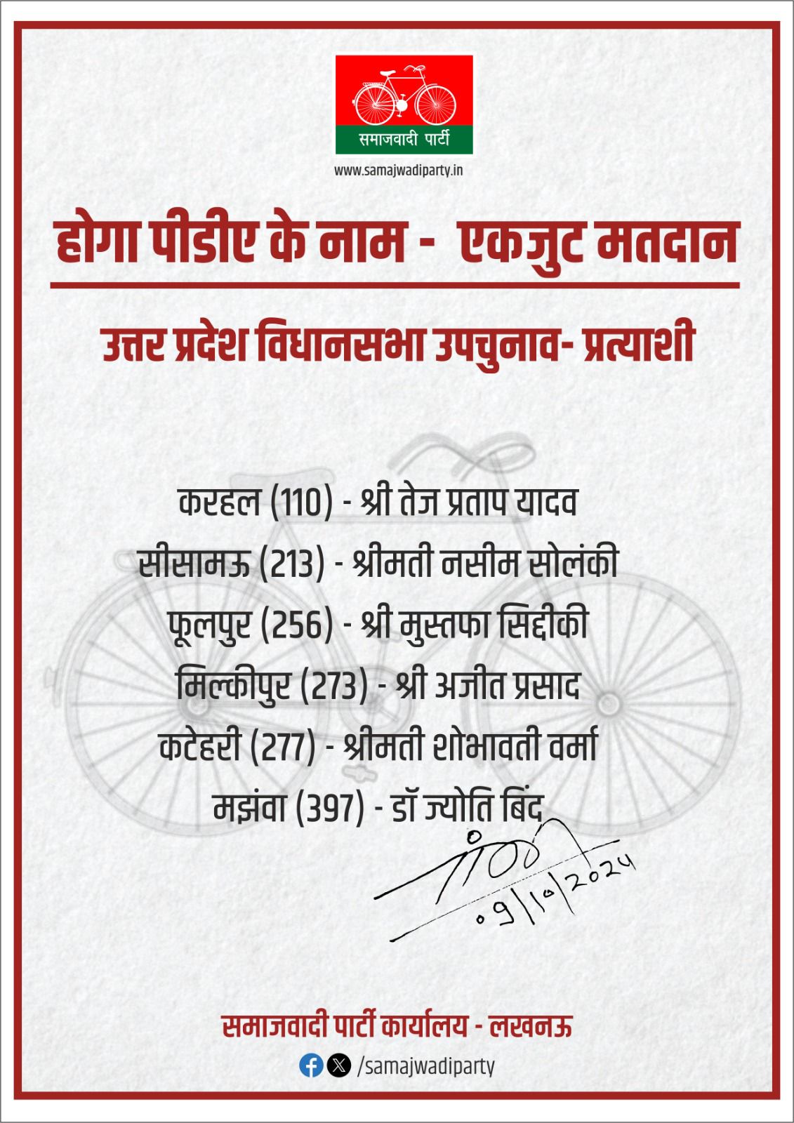 लखनऊ। समाजवादी पार्टी ने आज उत्तर प्रदेश में उपचुनाव के प्रत्याशियों की लिस्ट किया जारी। करहल (110)विधानसभा से तेज प्रताप यादव, सीसामऊ (213) विधानसभा से श्रीमती नसीम सोलंकी, फूलपुर (256)विधानसभा से मुस्तफा सिद्दीकी, मिल्कीपुर(273) विधानसभा से अजीत प्रसाद, कटेहरी (277)विधानसभा से श्रीमती शोभावती वर्मा, मझगवां(397) विधानसभा से डॉक्टर ज्योति बिन्द पर सपा ने उपचुनाव में जताया भरोसा।