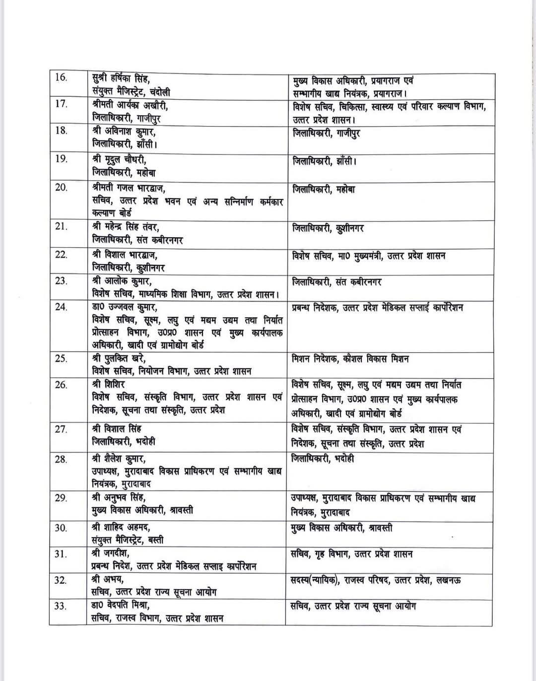 हर्षिका सिंह को सीडीओ प्रयागराज, आर्यका अखौरी को विशेष सचिव स्वास्थ्य एवं परिवार कल्याण, अविनाश कुमार को डीएम गाजीपुर, मृदुला चौधरी को डीएम झांसी, गजल भारद्वाज को डीएम महोबा, महेंद्र सिंह तंवर को डीएम कुशीनगर, आलोक कुमार को डीएम संतकबीरनगर, उज्जवल कुमार को एमडी यूपीएमएससीएल, पुलकित खरे को मिशन निदेशक कौशल विकास मिशन, शिशिर को विशेष सचिव एमएसएमई बनाया गया है।
