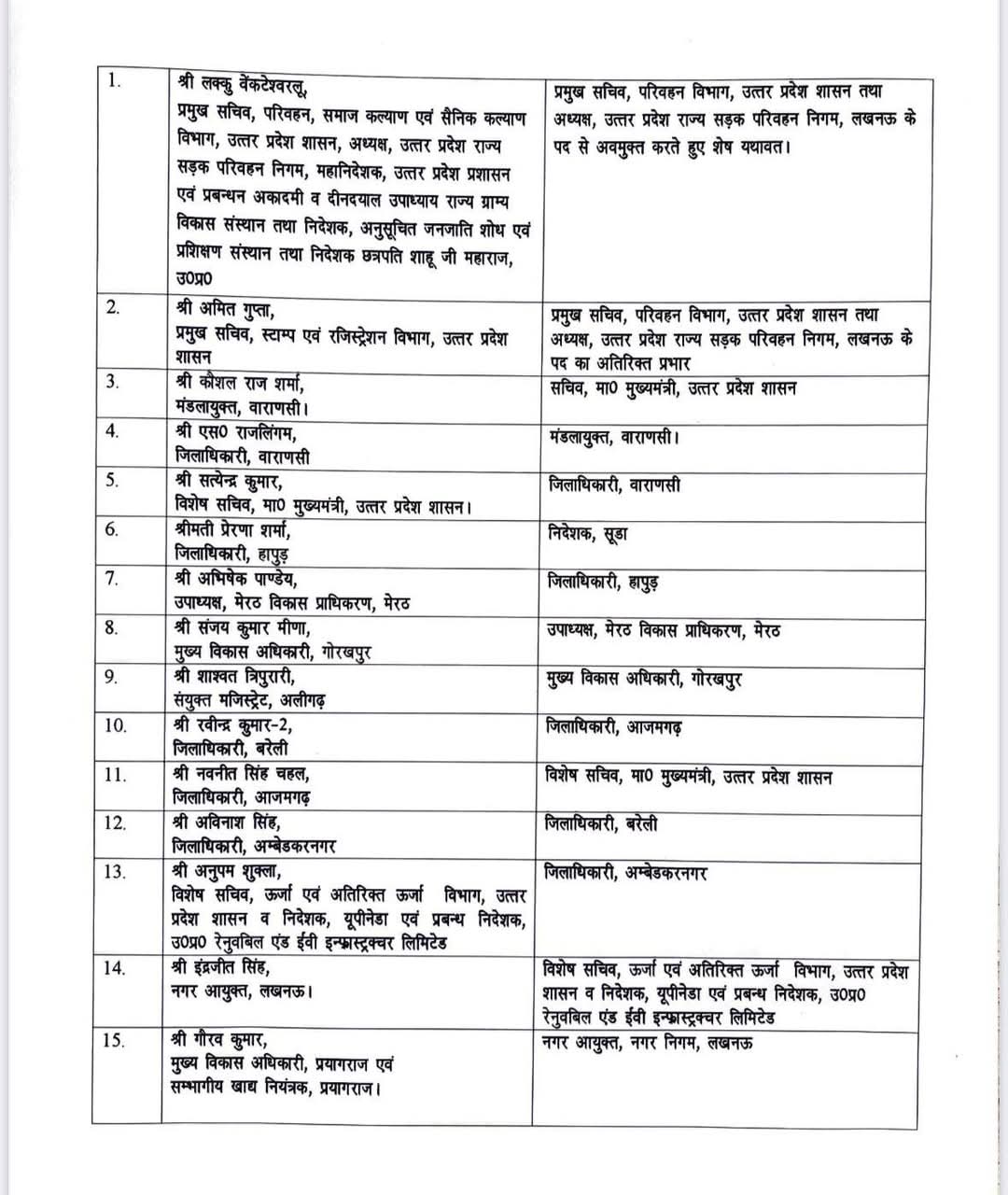 प्रमुख बदलावों में कौशल राज शर्मा को मुख्यमंत्री का सचिव, एस. राजलिंगम को वाराणसी मंडल का आयुक्त, सत्येंद्र कुमार को जिलाधिकारी वाराणसी, प्रेरणा शर्मा को सूडा का निदेशक, अभिषेक पांडे को हापुड़ का डीएम, संजय कुमार मीणा को मेरठ विकास प्राधिकरण का उपाध्यक्ष और शाश्वत त्रिपुरारी को सीडीओ गोरखपुर बनाया गया है।