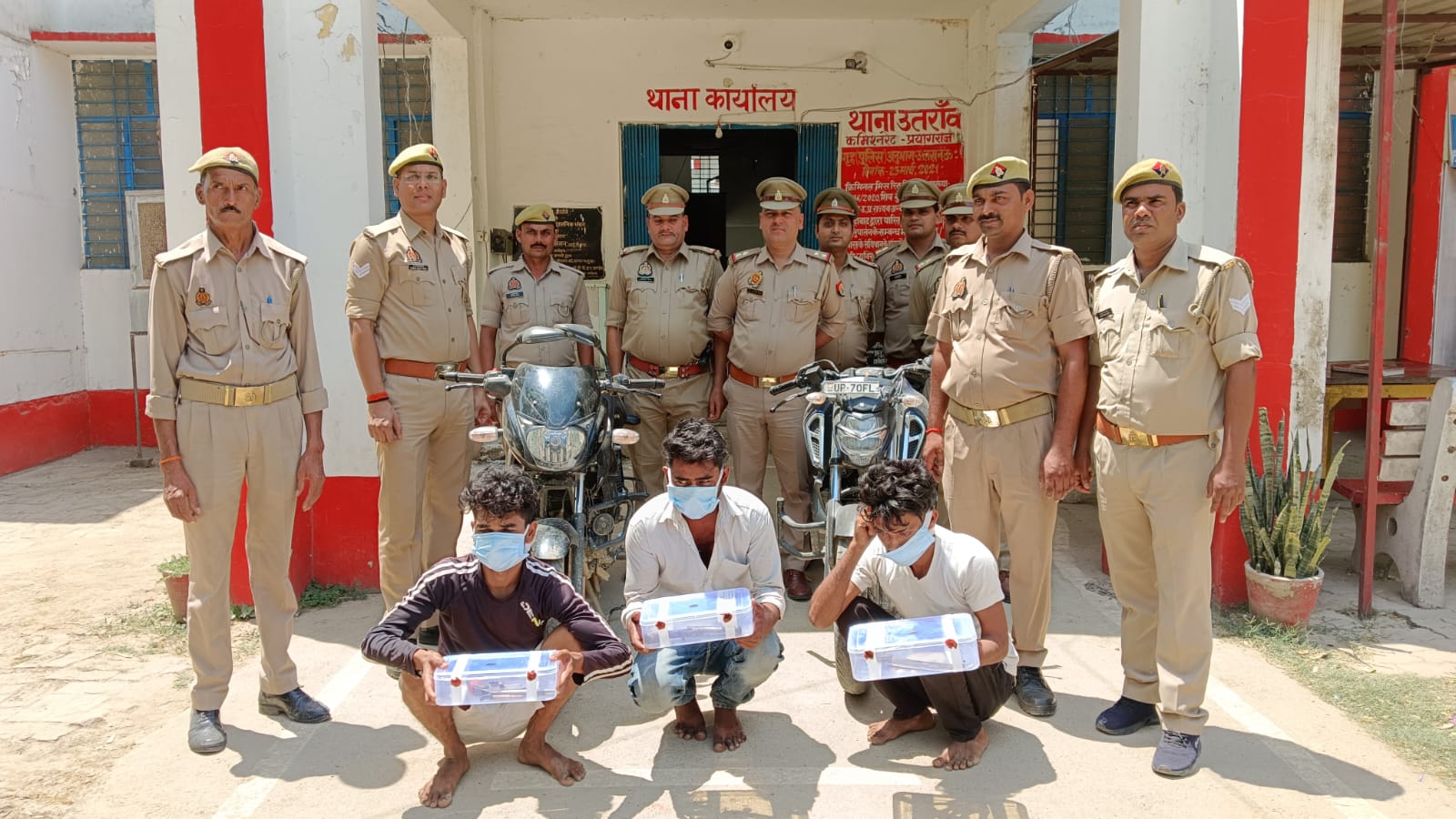 हंडिया प्रयागराज । उतरांंव थाना सहित अंय स्थानों पर लूट का अंजाम देने वाले हाईवे के तीन शातिर लुटेरों को पुलिस ने दबोच कर आठ घंटे में लूटकांड का खुलासा कर दिया। इन बदमाशों को उतरांव में छिनैती करना भारी पड़ गया। बता दें कि हंडिया के बम्वैला गाँव निवासी विशाल पटेल को उतरांव के हाईवे पर एक ढाबे के पास अज्ञात बदमाशों ने 21 अप्रैल को जमकर पिटाई कर बाईक, रुपया और आधार कार्ड छीन तमंचा लहराते भाग गयें थे। थानाध्यक्ष पंकज कुमार त्रिपाठी ने मामले में 23 अप्रैल को मुकदमा दर्ज कर अभियुक्तों की तलाश शुरू कर दी। मुखबिर की सूचना पर सटीक जानकारी मिलने पर हंडिया के ढोकरी और सरायमंसूर गाँव से संदिग्ध युवकों को दबोचा और कड़ाई से पूछताछ किया तो लूटकांड का खुलासा मात्र आठ घंटे में ही हो गया। इनके पास तमंचा कारतूस, चाकू और लूटकांड में प्रयुक्त बाईक समेत लूटी गयी बाइक पुलिस ने बरामद कर लिया। लूट में वांछित सुरेन्द्र, अमन, अंशु को जेल भेज दिया गया। वही शिवम की तलाश की जा रही है। शिवम के खिलाफ आधा दर्जन से अधिक मुकदमे है। वह लुटेरों के गिरोह का सरगना बताया जा रहा है।लूटकांड का खुलासा पर उतरांव पुलिस को पुरष्कृत करने की डीसीपी गंगानगर अभिषेक भारती ने घोषणा की है।उतरांव क्षेत्र में एसीपी हंडिया पंकज लवानिया और उतरांव थानाध्यक्ष पंकज कुमार त्रिपाठी की सख्त कार्यवाही से अपराधियों की शामत आ गयी है।वही घटना को अंजाम देने पर अपराधी तुरंत सलाखों के पीछे जा रहे है।