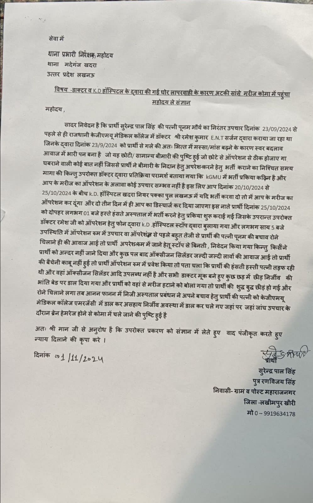 केजीएमयू ईएनटी विभाग के डॉ. रमेश कुमार पर आरोप है कि उन्होंने प्राईवेट प्रैक्टिस एवं इलाज के दौरान खदरा स्थित केडी अस्पताल में मरीज को भर्ती कराया था। इलाज के दौरान मरीज की मृत्यु हो गई थी। इस प्रकरण का डिप्टी सीएम ब्रजेश पाठक ने संज्ञान लिया है। उन्होंने कहा कि इस प्रकार की घटनाओं से संस्थान, विभाग तथा सरकार की छवि धूमिल होती है। प्रकरण की जांच के निर्देश देते हुए उन्होंने सीएमओ को खदरा स्थित केडी अस्पताल की भूमिका एवं वहां की व्यवस्थाओं को परखने के लिए भी कहा है। एक सप्ताह में जांच रिपोर्ट प्रेषित करनी है।
