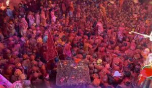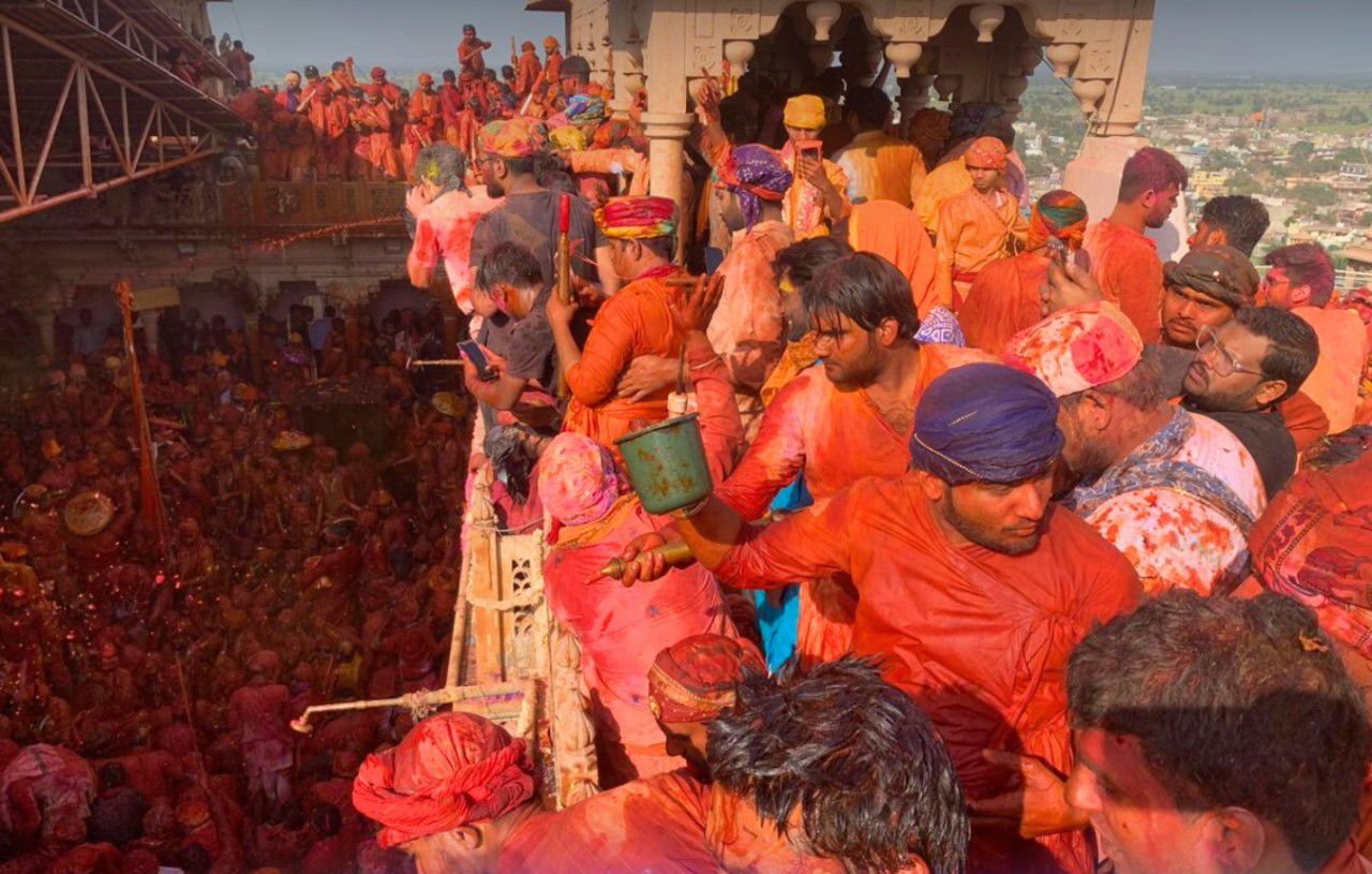 दरसन दै निकरि अटा में ते, दरसन दै… गाते हुए हुरियारों ने ध्वजा को किशोरी जी के पास रख दिया। मंदिर परिसर में दोनों गांवों के गोस्वामियों ने समाज गायन में एक- दूसरे पर प्रेम भरे कटाक्ष किए। इसके बाद हुरिया रंगीली गली में पहुंचे तो, हुरियारिनें रंगेश्वर महादेव मंदिर और घरों के दरवाजे पर घूंघट की ओट में टोल बना कर खड़ी मिलीं। उन्हें देख हुरियारों ने पंचम वेद के पदों का गायन किया तो हुरियारिनों ने भी रसियों से जवाब दिया। सवा पांच बजे एक हुरियारिन ने हुरियारों को खदेड़ने के लिए लाठी मारी, जिसे बड़ी कुशलता से ढाल पर रोक लिया। श्री लाडली जी मंदिर से लेकर रंगीली गली तक राधा- कृष्ण के जयकारे गूंजते रहे। भक्ति और प्रेम के रंग में रंगने के लिए श्रद्धालुओं की इतनी भीड़ उमड़ी कि मंदिर में पैर रखने तक की जगह नहीं थी।