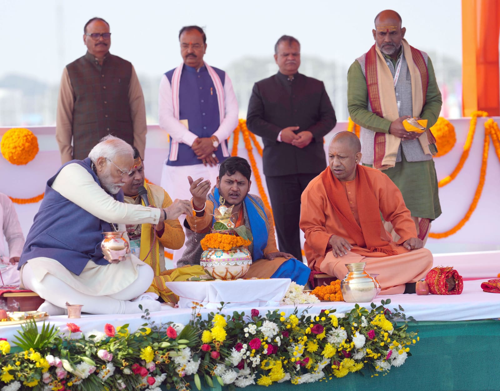 प्रधानमंत्री मोदी ने संगम नोज में कुम्भ कलश का किया कुम्भाभिषेक,रत्न जड़ित, अष्ट धातु से बना विशिष्ट कुम्भ कलश