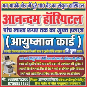 प्रयागराज। गंगा तट पर स्थित ऐतिहासिक एवं धार्मिक नगरी श्रृंगवेरपुर और आसपास के ग्रामीण क्षेत्रों के लोगों के लिए स्वास्थ्य सुविधाओं के क्षेत्र में एक बड़ी राहत सामने आई है। श्रृंगवेरपुर से सटे चकिया–जगदीशपुर (भगौतीपुर) क्षेत्र, हिना पैलेस के पीछे, मंसूराबाद, प्रयागराज में स्थित आनंदम हॉस्पिटल अब 100 बेड की पूर्ण सुविधायुक्त व्यवस्था के साथ आधुनिक चिकित्सा सेवाएं उपलब्ध करा रहा है।