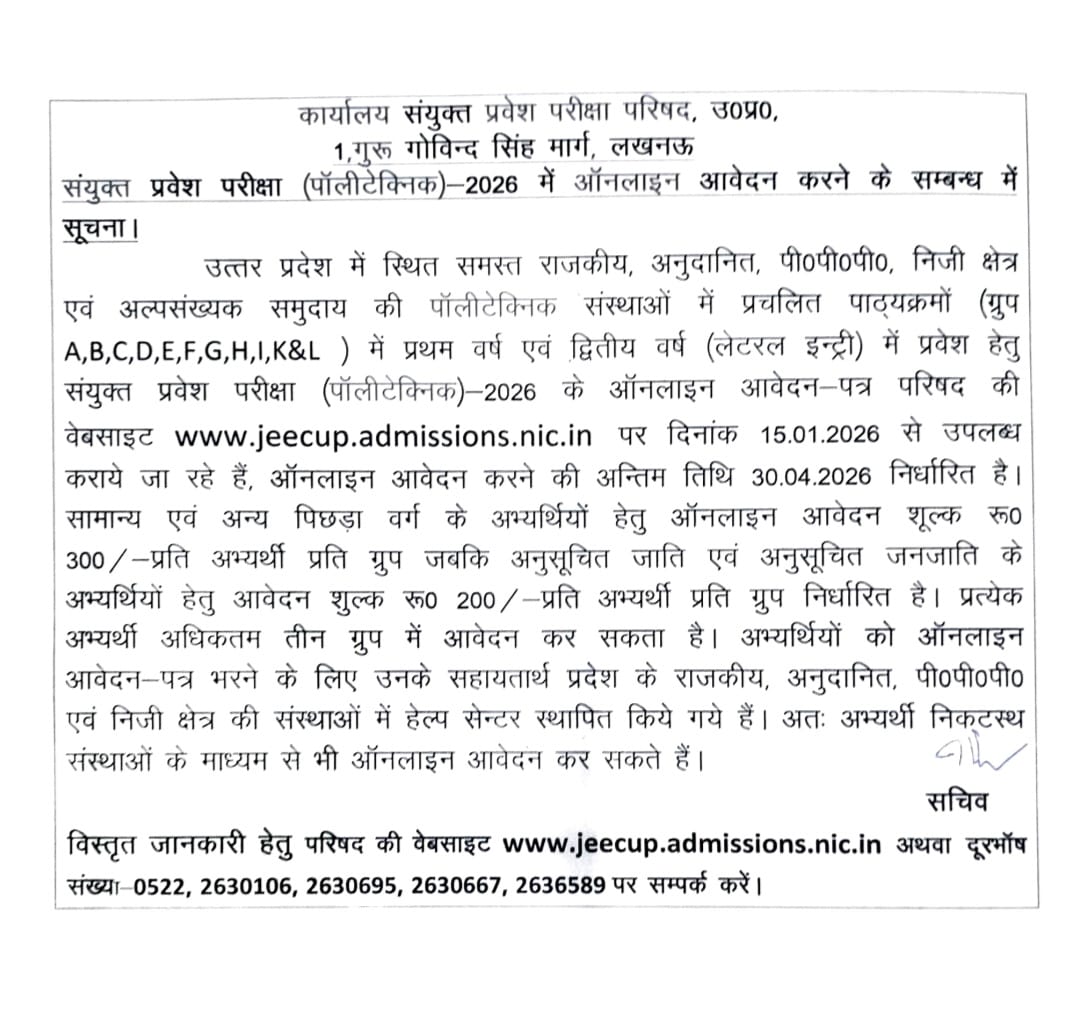 संयुक्त प्रवेश परीक्षा (पॉलीटेक्निक)-2026 के लिए ऑनलाइन आवेदन 15 जनवरी से शुरू